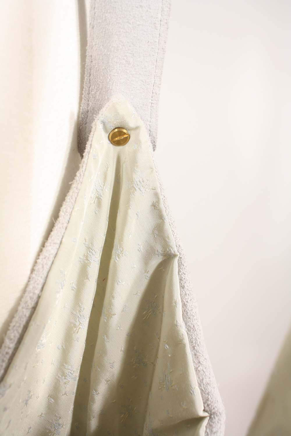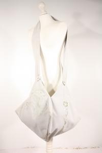 Oh, this is just an amazing FairyBag. Made from an off-white suede, decorated with art-deco-style embroideries on all foursides and fabriclined. it has no inner pockets. Cause of the typical FairyBag shape (i just learned that it is called a "Rhomboeder" ;-)) it has so much space inside, you can fit in a small weekend-shopping if need be! The hight is approximatly 40cm.