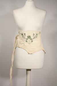 A cosage with long ties and an amazing ivy twine embroidery in various colors.